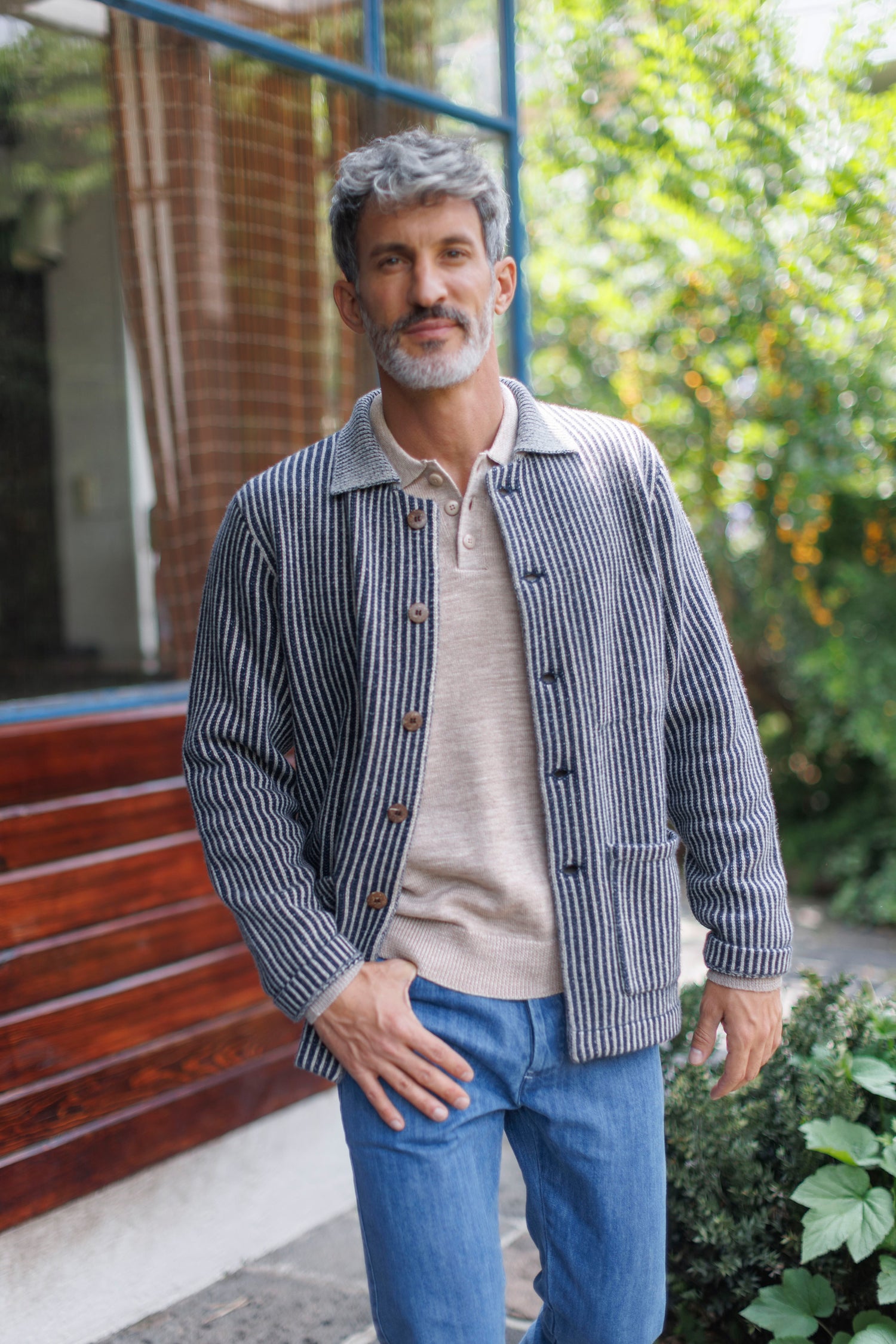 Lisandro's wearing the Knit Kite Jacket in Lines over an Anchor Polo in Bone, finished with Denim Cham Pants in Ocean. It's an easy rotation that works when temp drops—the Knit Kite Jacket adds warmth and texture while the Anchor Polo keeps things relaxed and breathable.