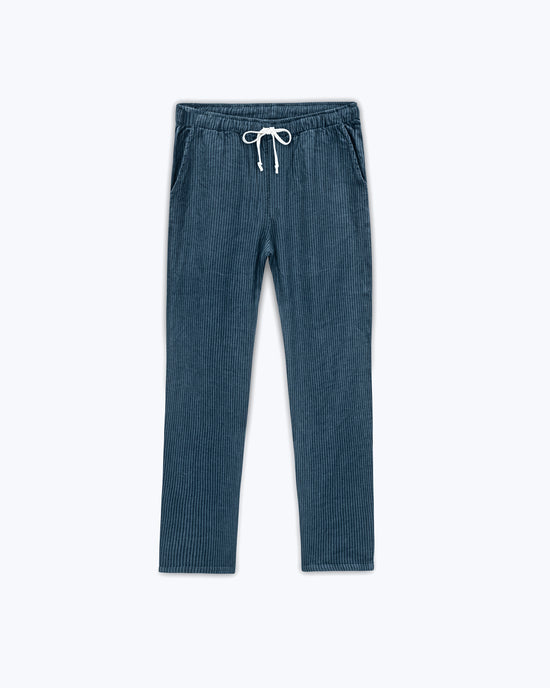 Deep blue striped linen drawstring pants made with sustainably-grown French linen and washed with biodegradable softeners.