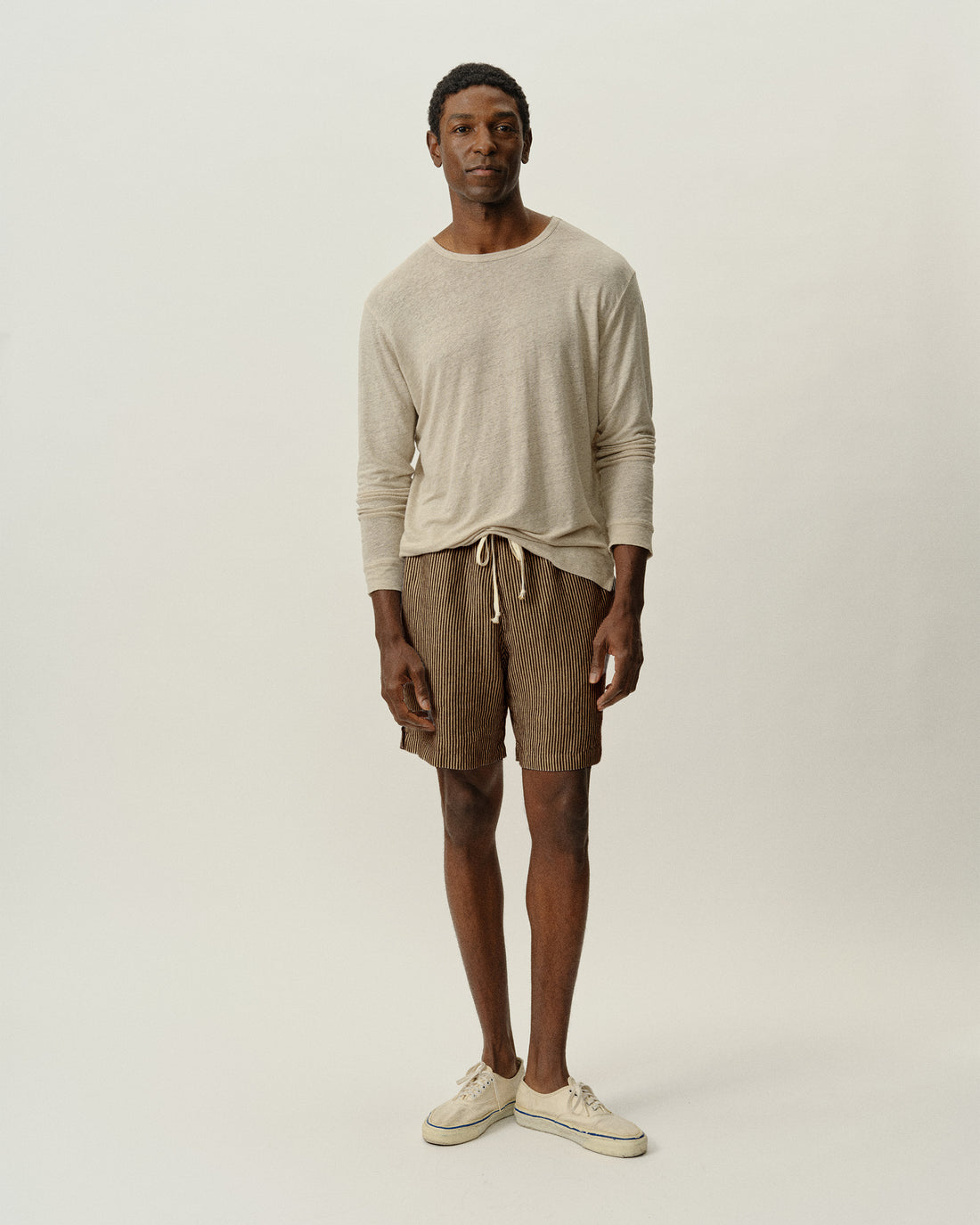 A relaxed drawstring linen short cut in a yarn-dye stripe, overdyed in chai â part pattern, part wash. The natural yarn variation gives it a lived-in quality from day one. The natural rubber waistband moves with you. Spun from Normandy flax, the highest-quality in the world.