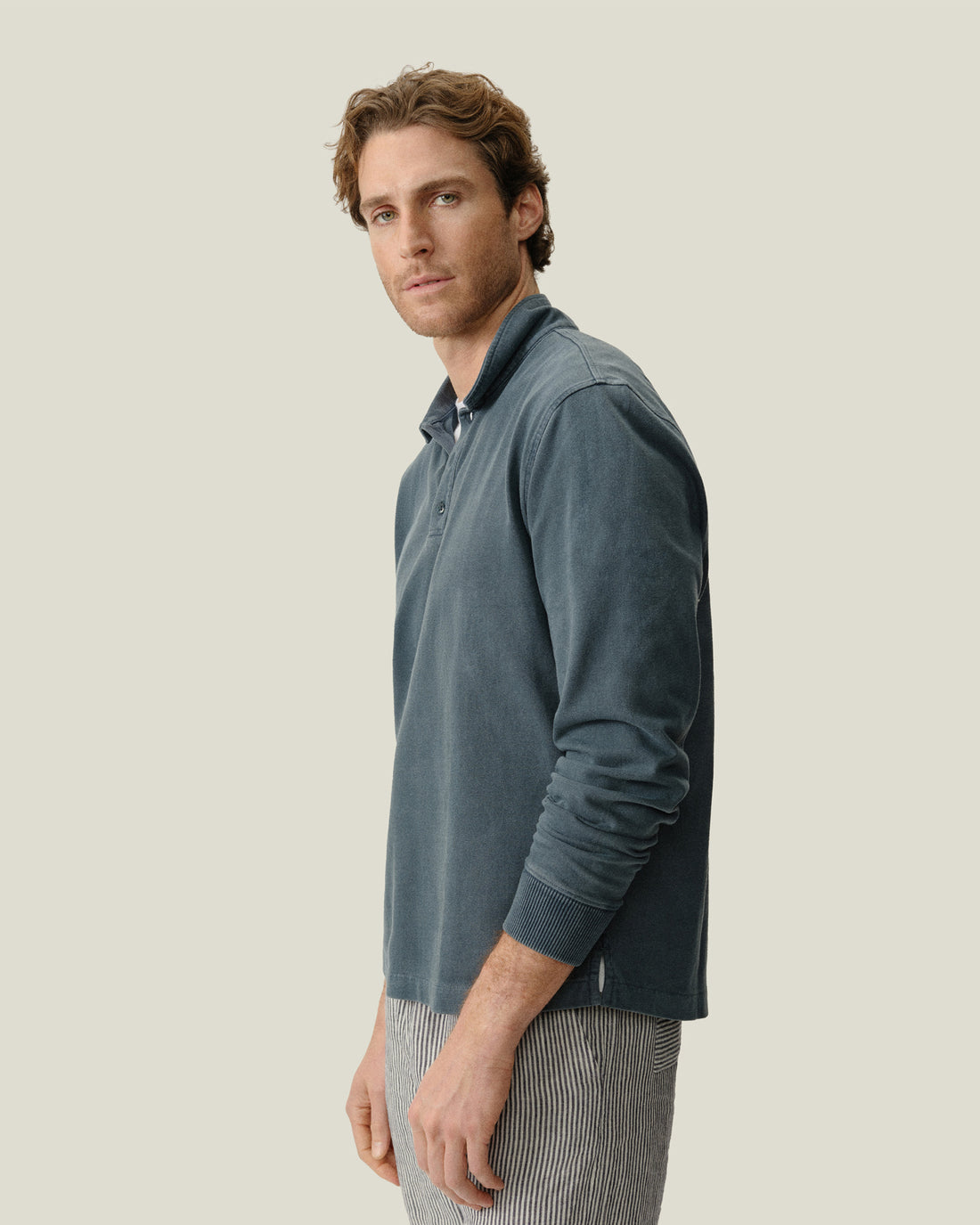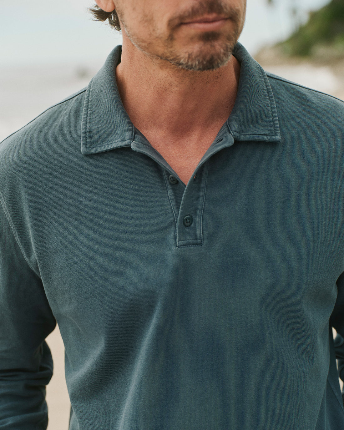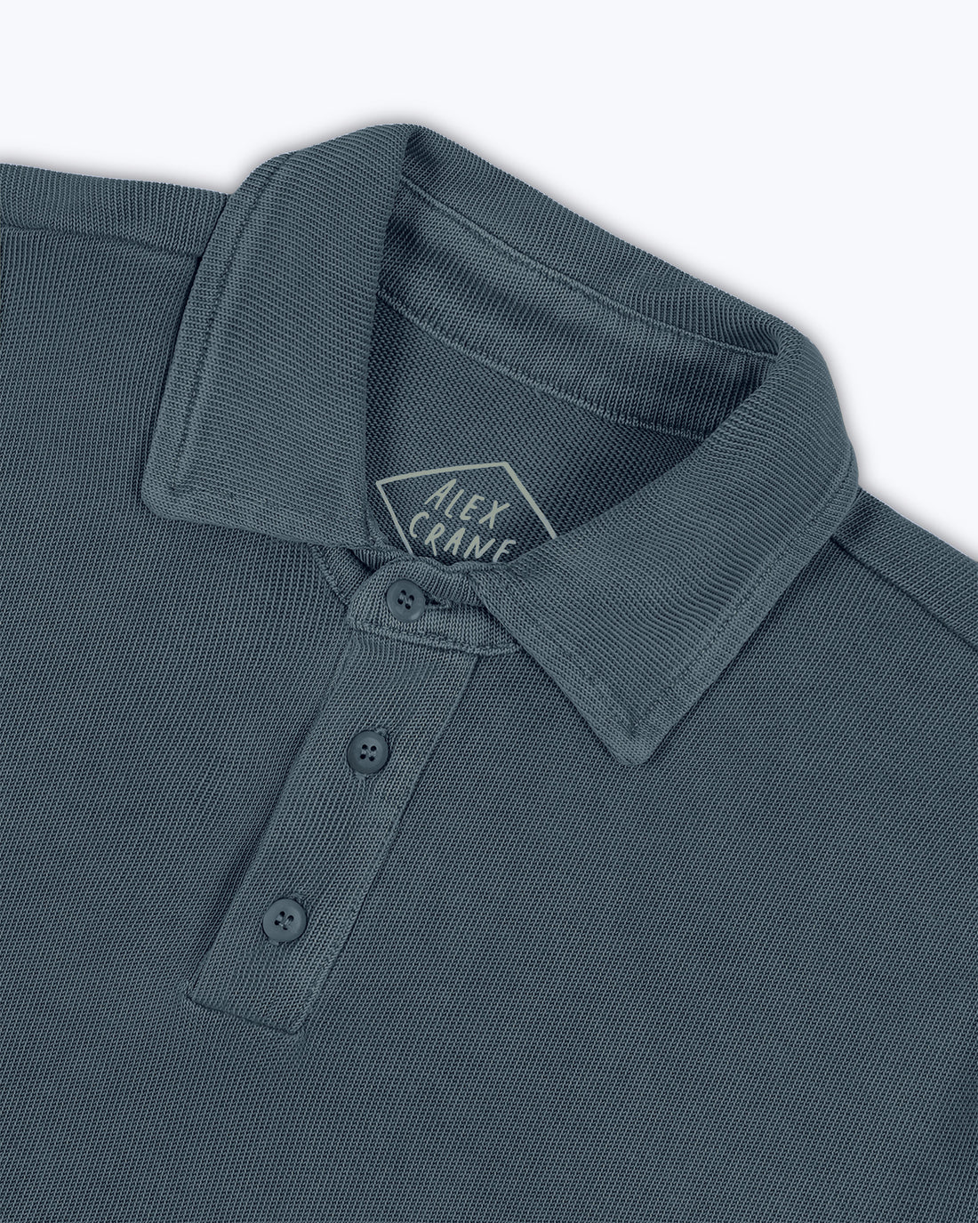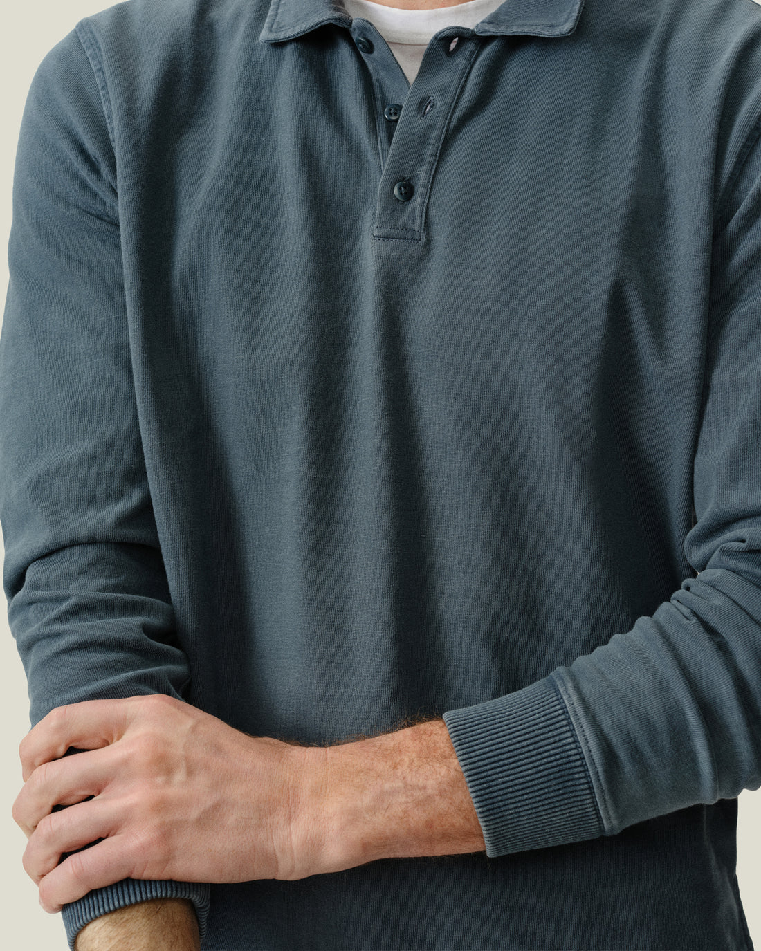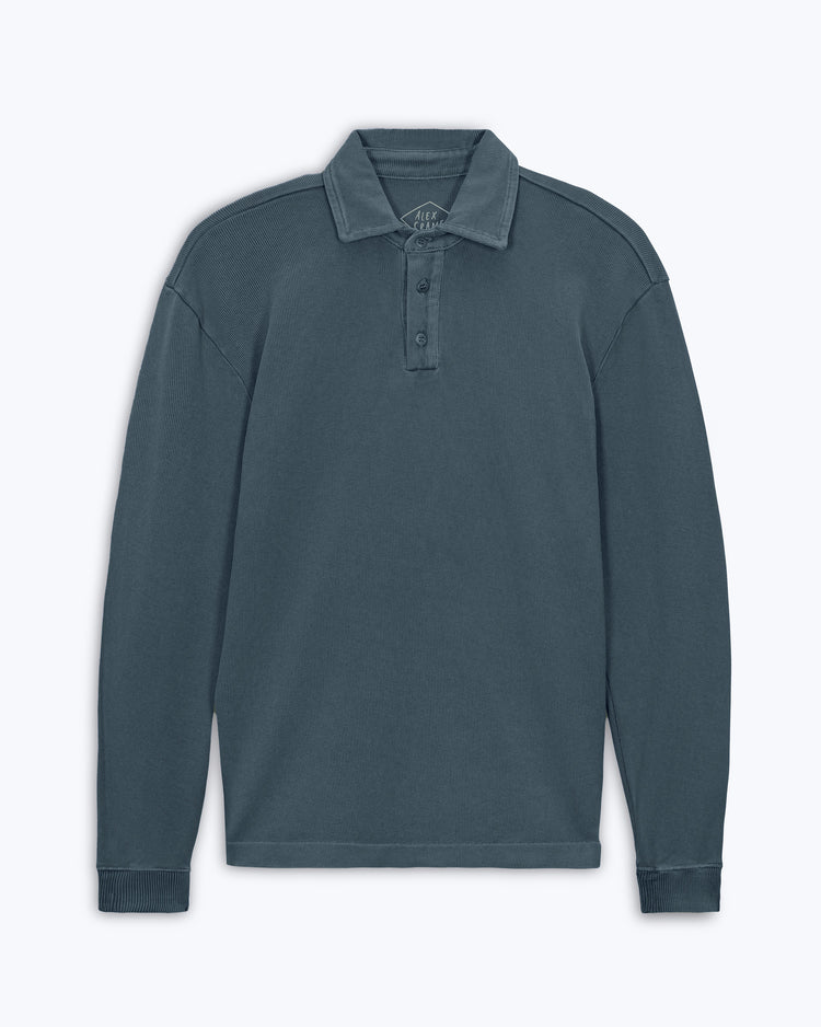 A mid-weight organic cotton polo in a slubby rib, garment-dyed deep blue with natural mineral dyes. Color settles into the seams and corozo buttons — tonal, lived-in. Cut from Punjab cotton, where cultivation began 6,000 years ago.