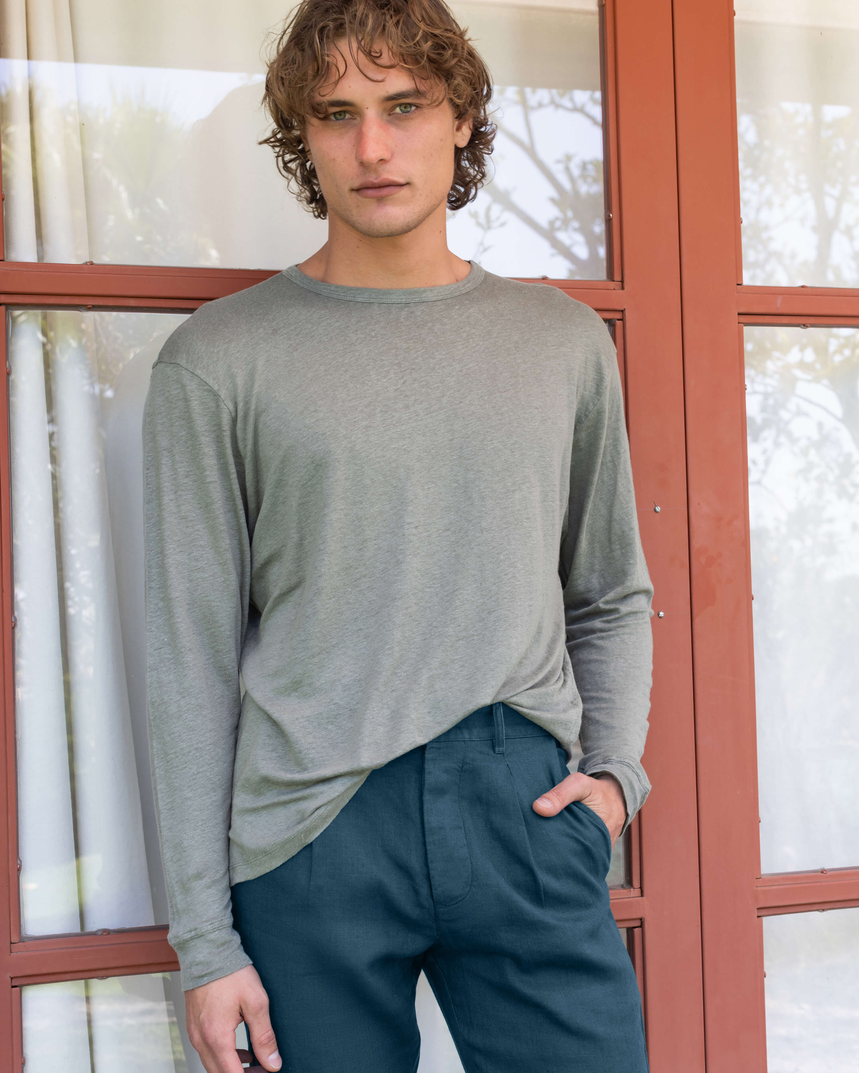 A mineral green long sleeve t-shirt made with sustainably grown French linen, knit in Portugal and washed with biodegradable softeners.