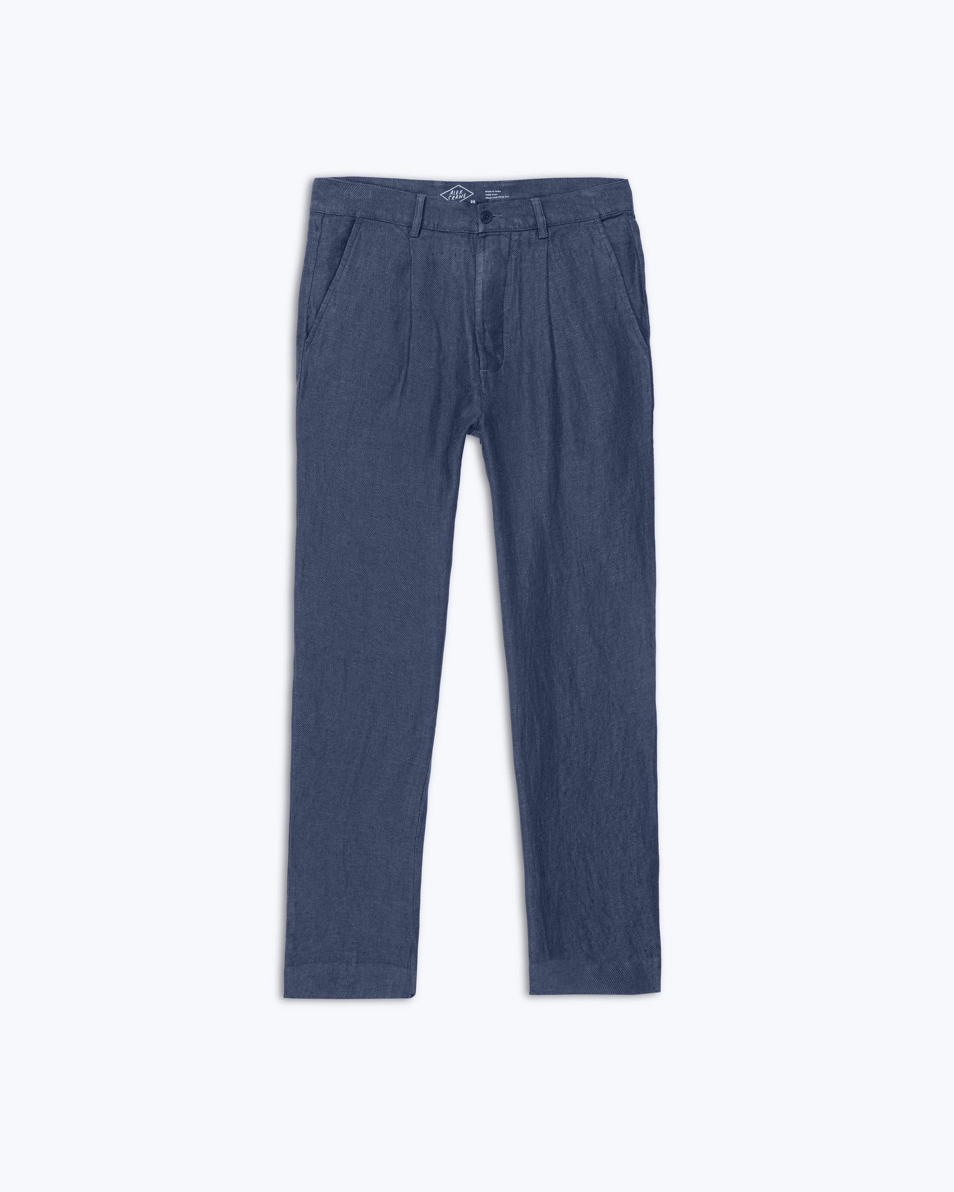 Twill linen suit pants made with yarn-dyed French flax and washed with biodegradable softeners. Features a high waist, front pleat, straight leg, and button-fly. Pair with the Alta Blazer to complete the suit.