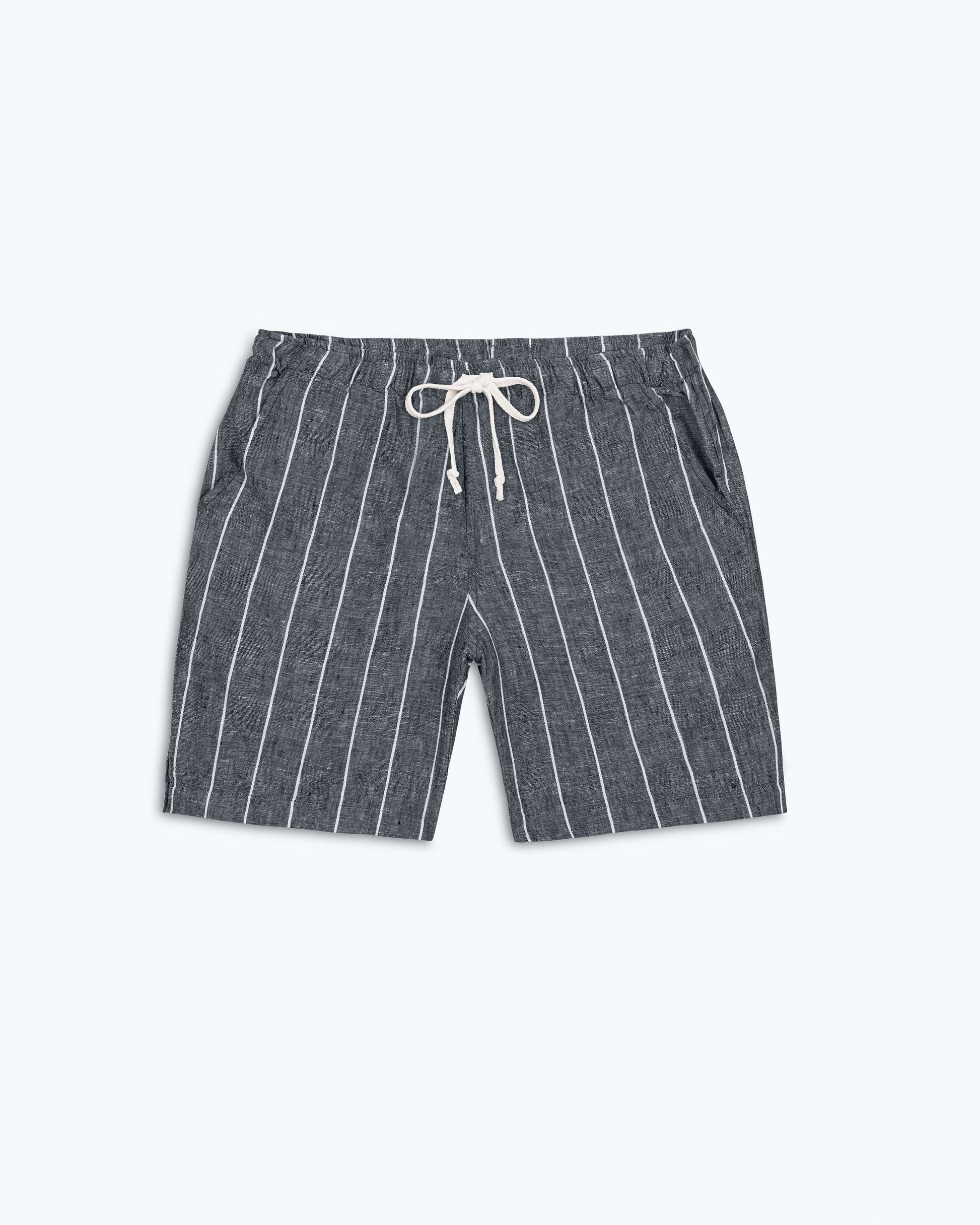 A chalk striped yarn-dye drawstring short made with sustainably-grown French linen and washed with biodegradable softeners.