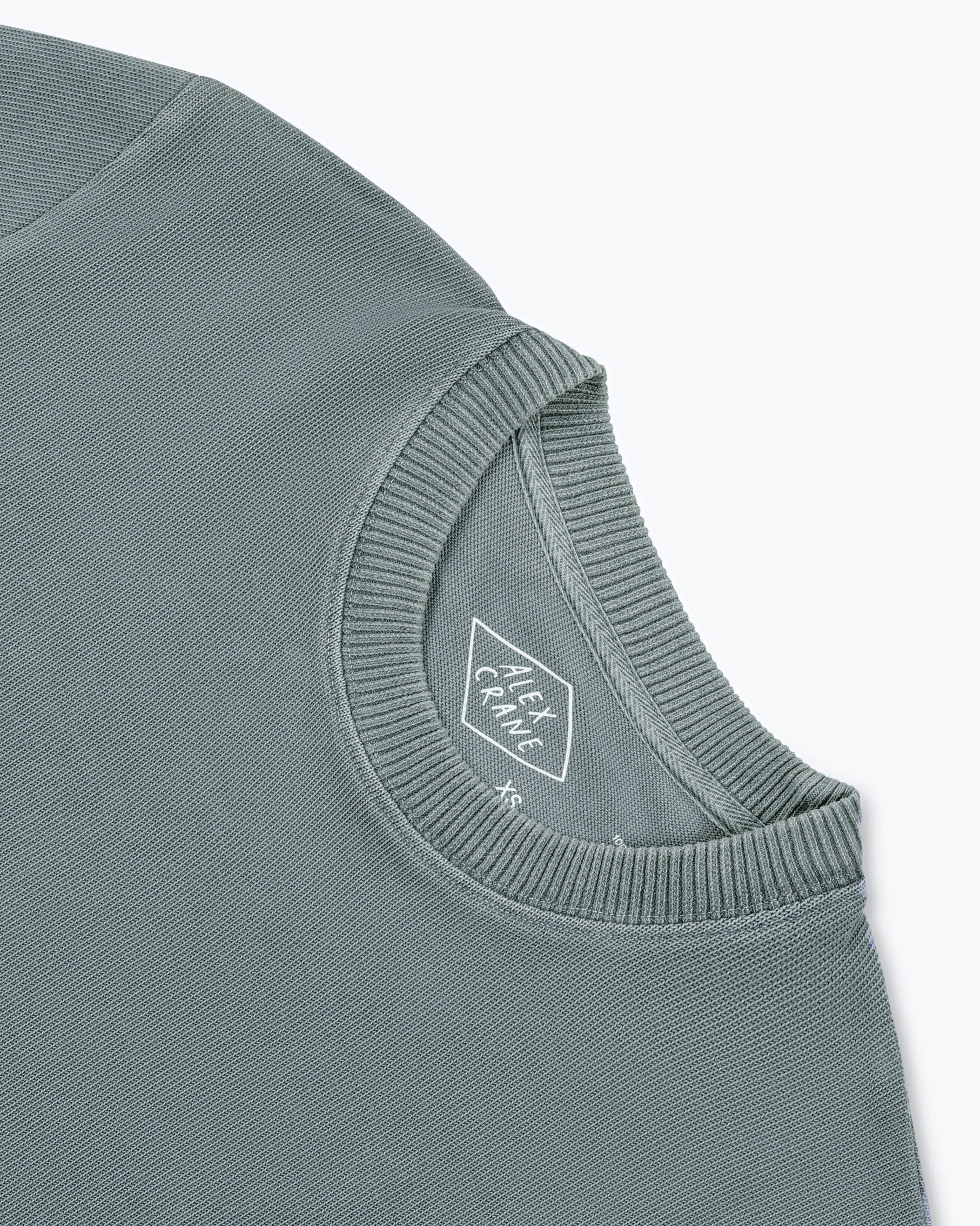 A mineral green slubby cotton crewneck knit with 100% organic cotton, garment dyed with natural dyes, and washed in biodegradable softeners.