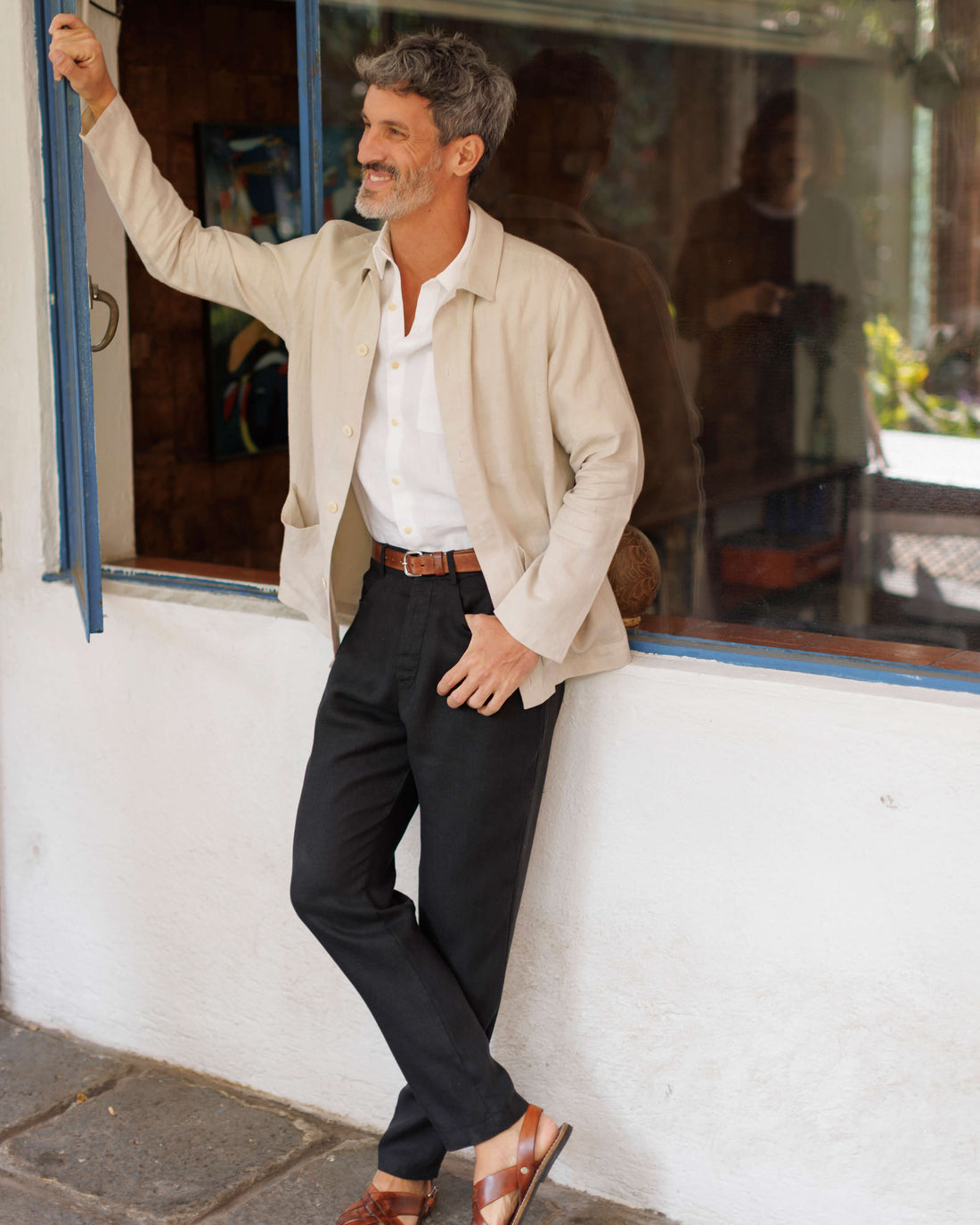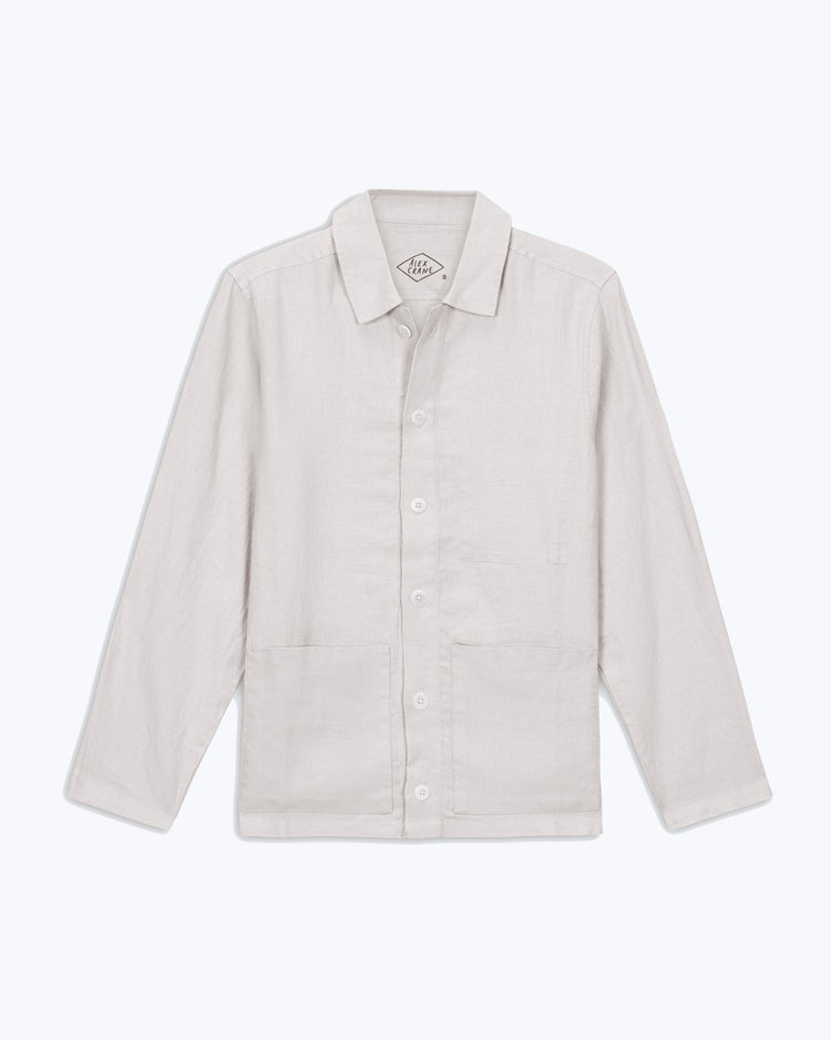 A natural linen jacket made with sustainably-grown French linen and washed with biodegradable softeners. The jacket features two front pockets and an interior breast pocket.