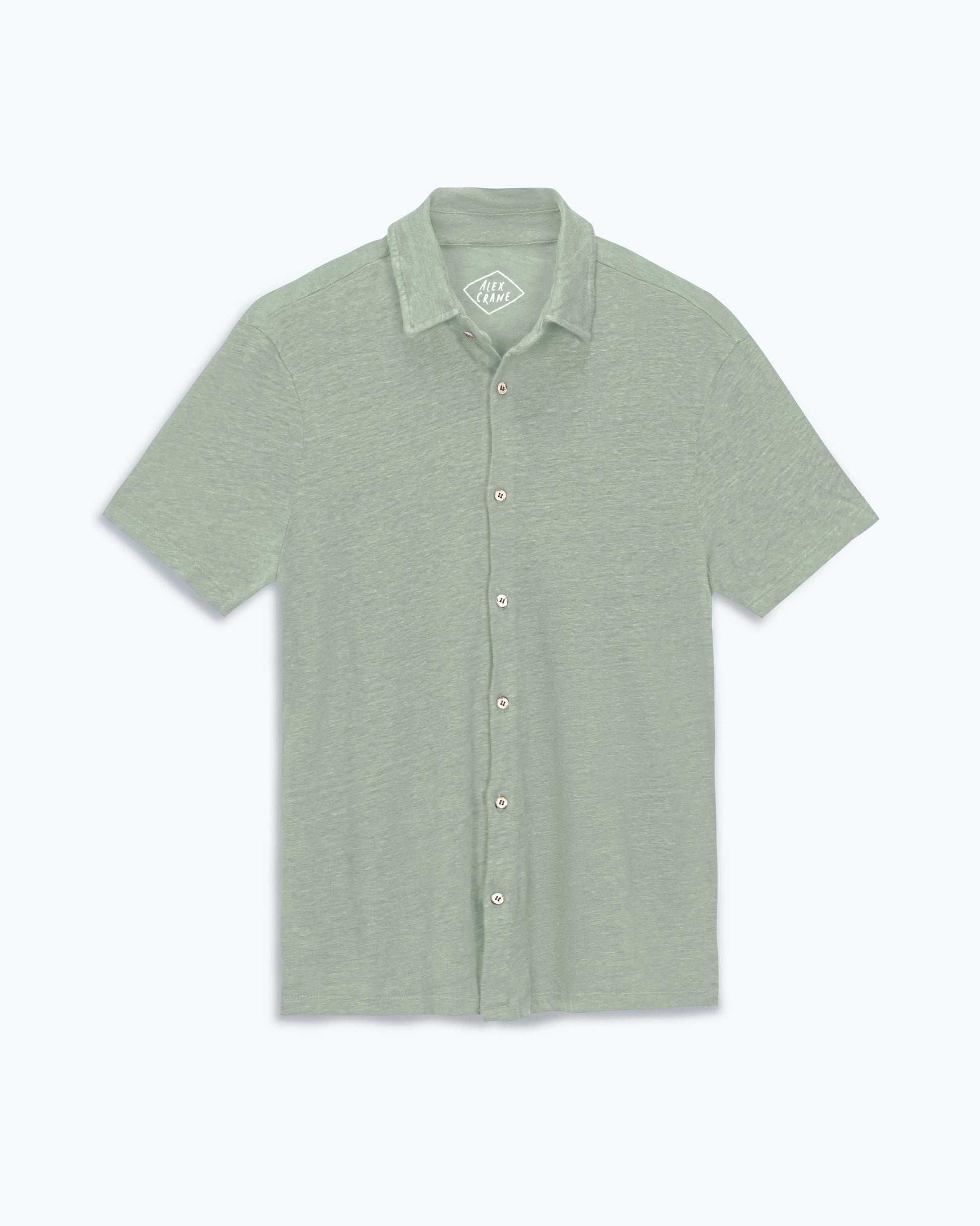 An army green short sleeve button-up made with sustainably-grown French linen, coconut buttons, and dyed with natural pigments.