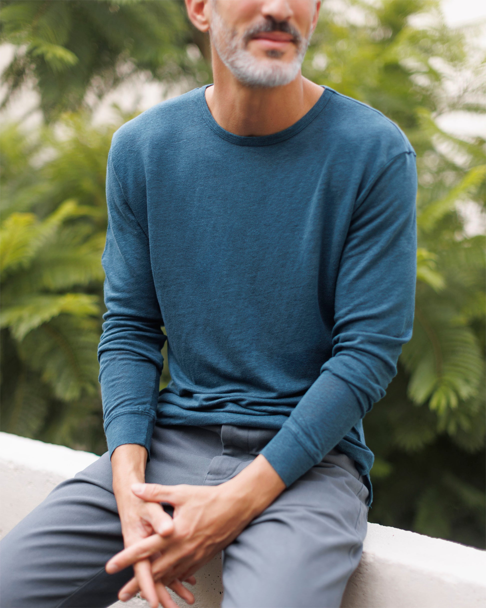 A deep blue linen long sleeved t-shirt made with sustainably grown French linen, knit in Portugal and washed with biodegradable softeners.