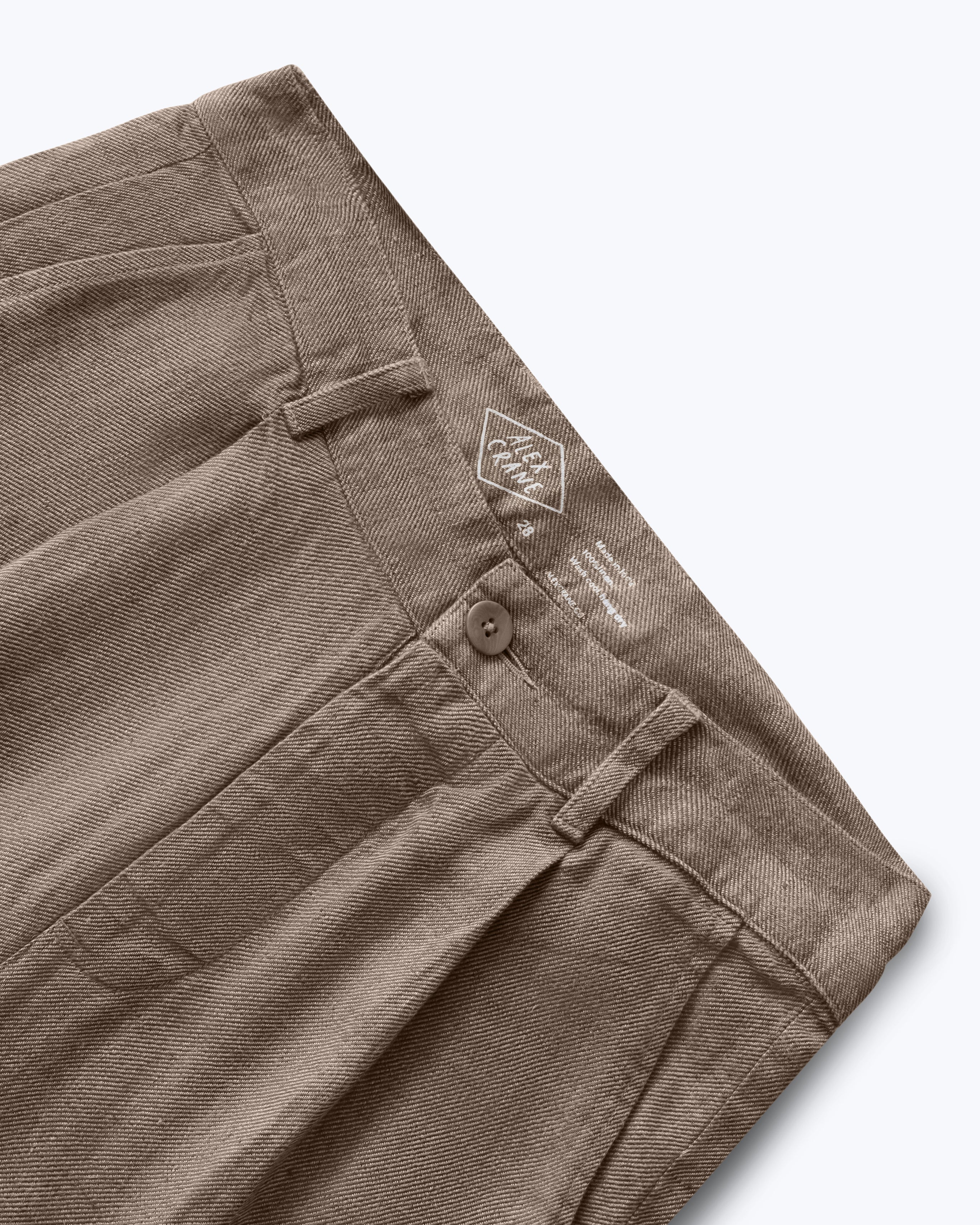 Twill linen suit pants made with sustainably-grown French linen and washed with biodegradable softeners. The fly buttons are made with corozo, a Brazilian nut known as "plant ivory."