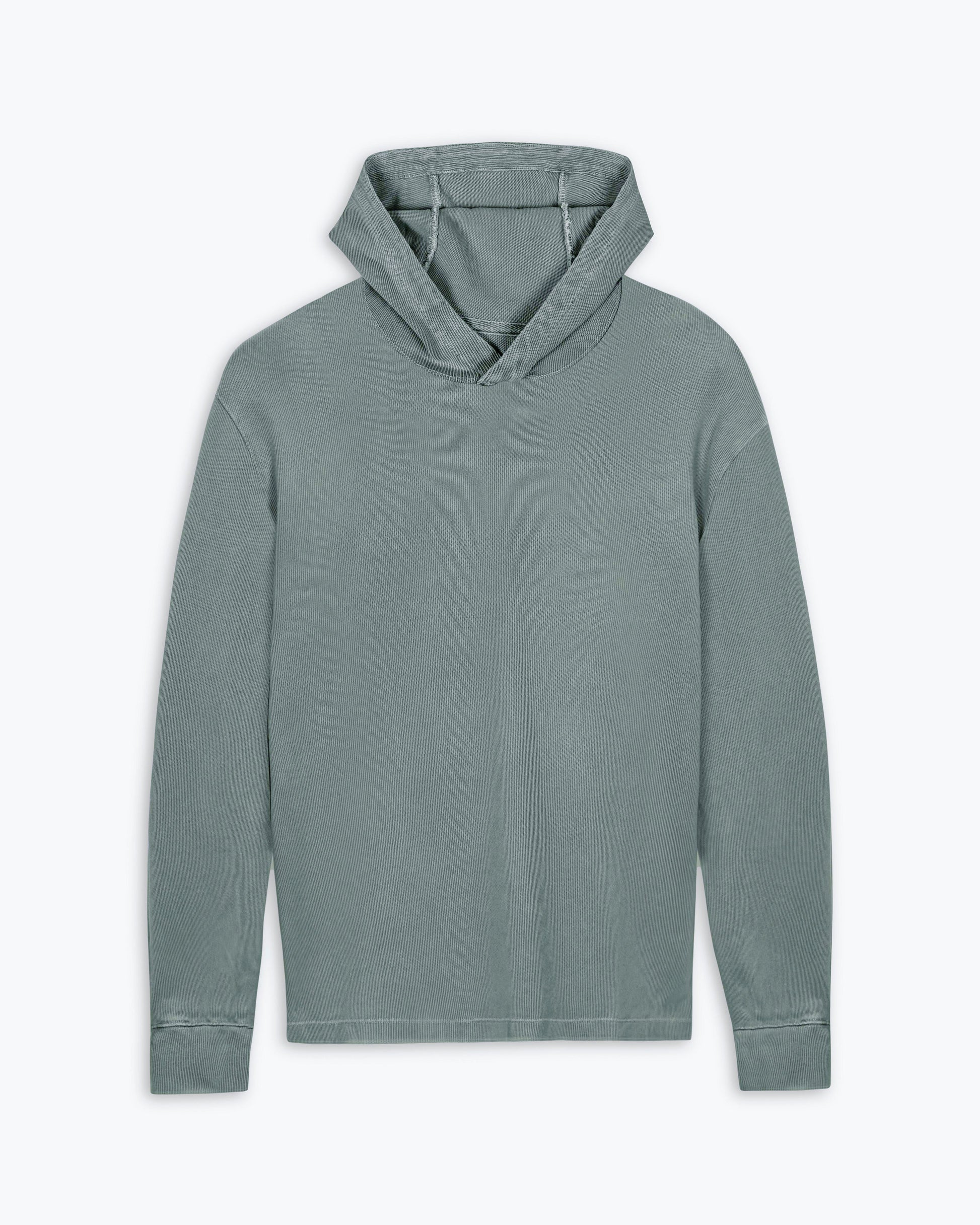 A mineral green slubby cotton hoodie knit with 100% organic cotton, garment dyed with natural dyes, and washed with biodegradable softeners.